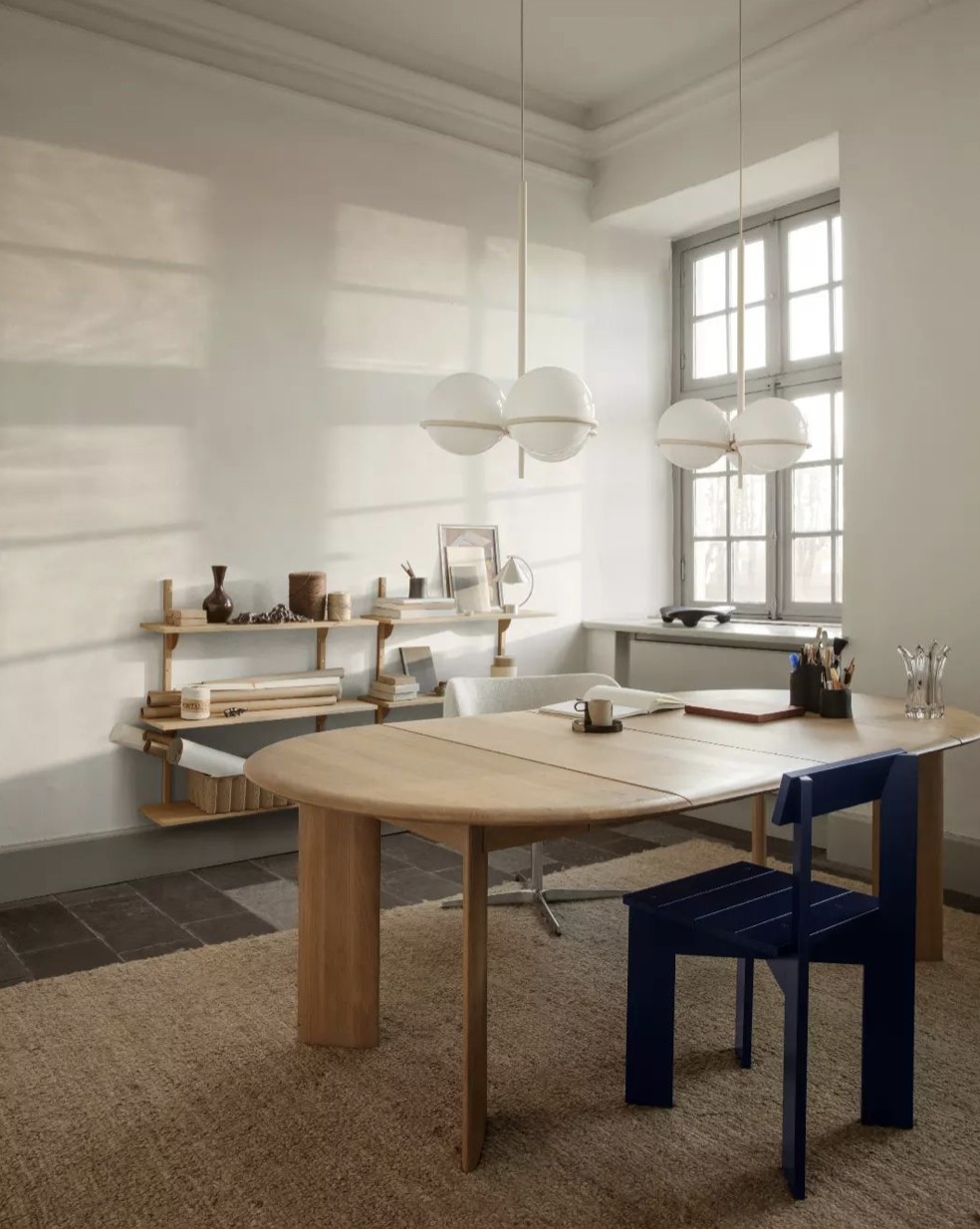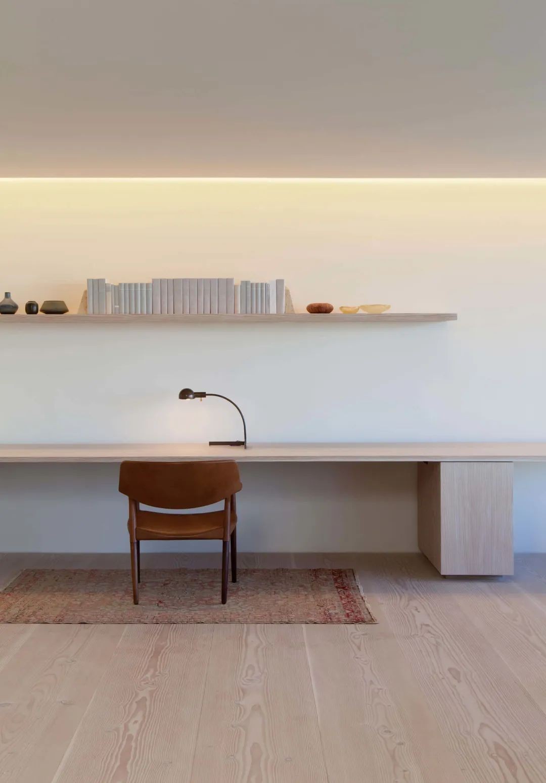 靠墙设置长桌,不仅可以拥有宽大的空间,还能多人使用,家人孩子一起读书都不会显拥挤。同时有了墙面的加持,还可以增加一些隔板做收纳,这样书籍近在手边,坐下来就可以随时阅读,拿取动线更方便。