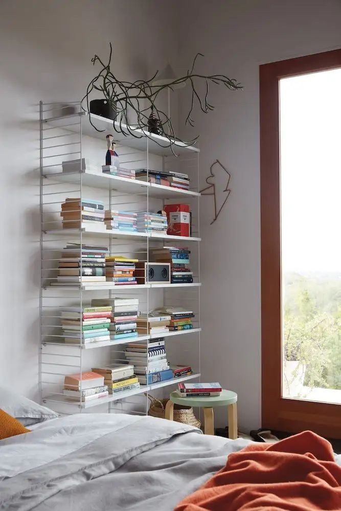 喜欢在睡前看书的小伙伴,可以选择用开放式隔板架在床头装一组书墙,书脊向外层层摆好,堆叠中不缺失秩序,拿取也足够方便,隔板可以随时根据书目调整高度,收纳非常灵活。