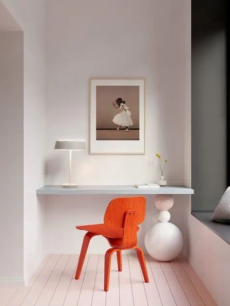 如果阅读时有做笔记的习惯,用一张桌子来代替阅读角是更实用的选择,低调的色系更好融入空间,同时用几个亮色单品祛除单调即可。桌面只摆放书籍、笔、装饰画和灯具等必需品,不被琐碎物品所累,就可以更高效、专注的利用好时间,写写画画,做做摘抄,就算不刻意背诵,烂笔头也能帮你加深一遍记忆。