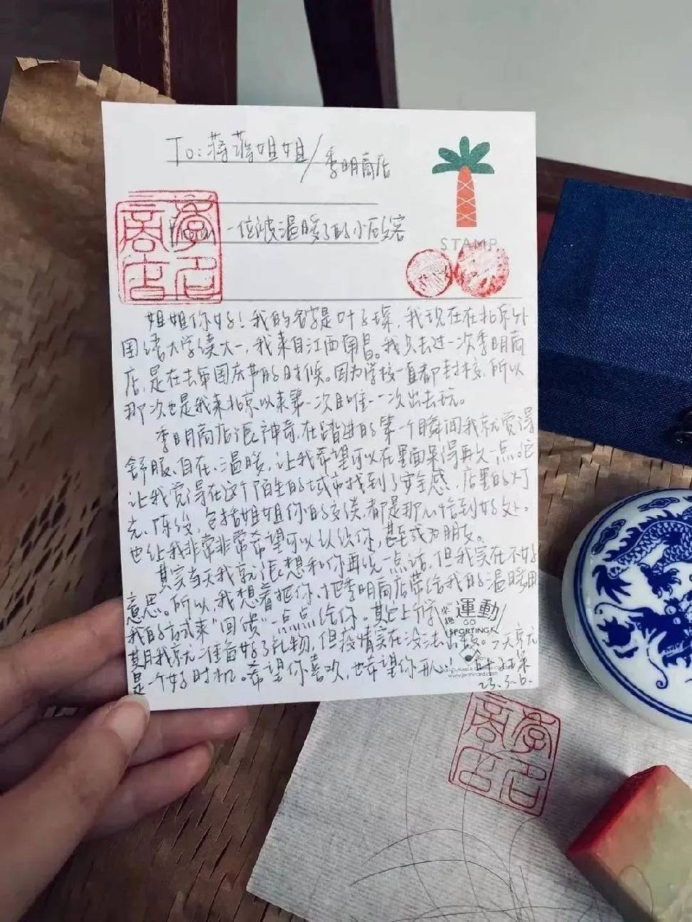明信片里悉数回忆了与季明的相遇,还特别定制了“季明商店”的印章作为小礼物相赠~蒋蒋说,这已经是记不清多少次的温暖了,这样的客人很多,但每每依旧感叹于大家的珍贵和自己的幸运,她要继续珍藏起来~