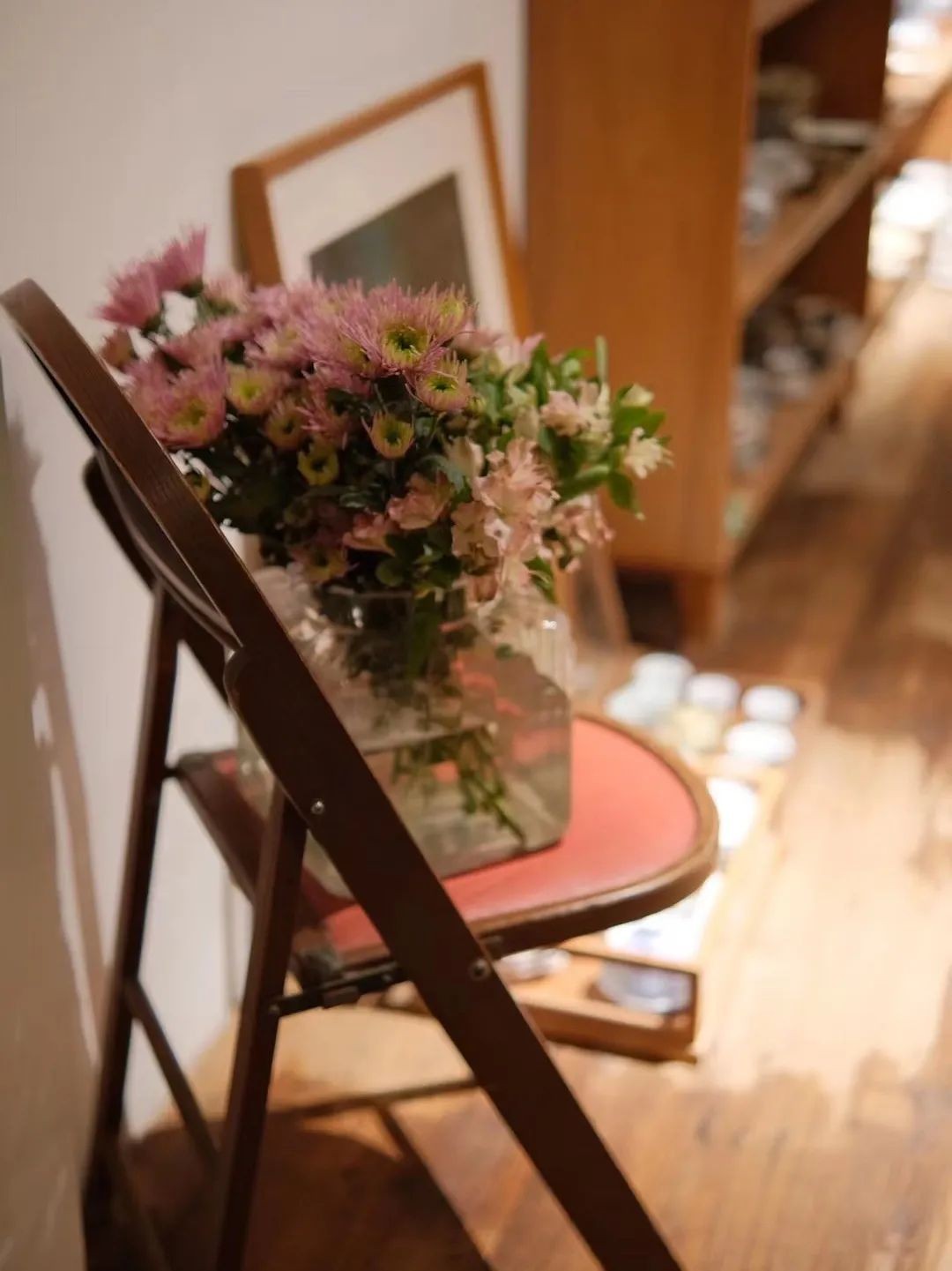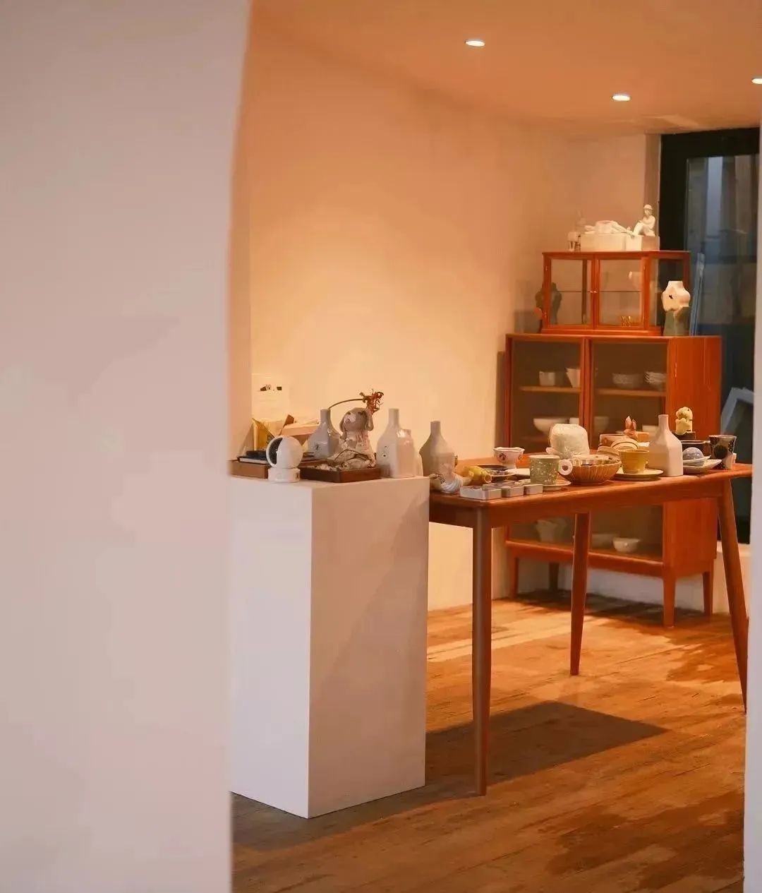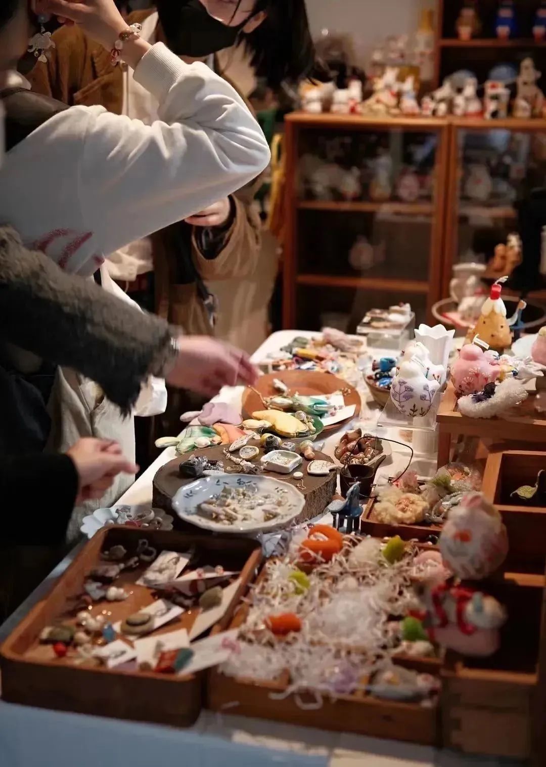 推门而入,空间不大但很有温度,靠墙摆着一排排木架子,中间的桌面铺着木质收纳盒,陈列着大大小小的物什,大到碗盘、花瓶,小到胸针、耳饰…满满当当,又次序分明,是那种静下心来可以待一下午的空间,每一隅都藏着惬意。
