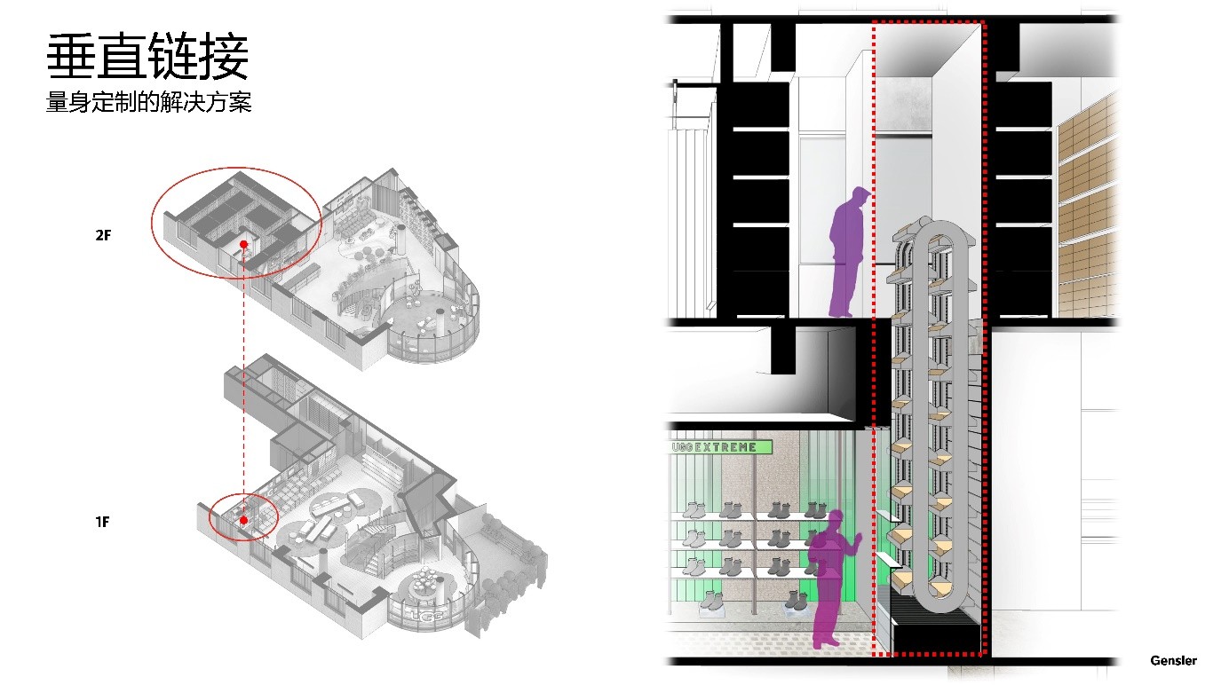 在三楼的库房和二楼的零售空间之间,Gensler和Suntop团队设计了一个连接二楼和三楼的垂直输送装置,为门店的实际运营提供了一个创新性解决方案。
