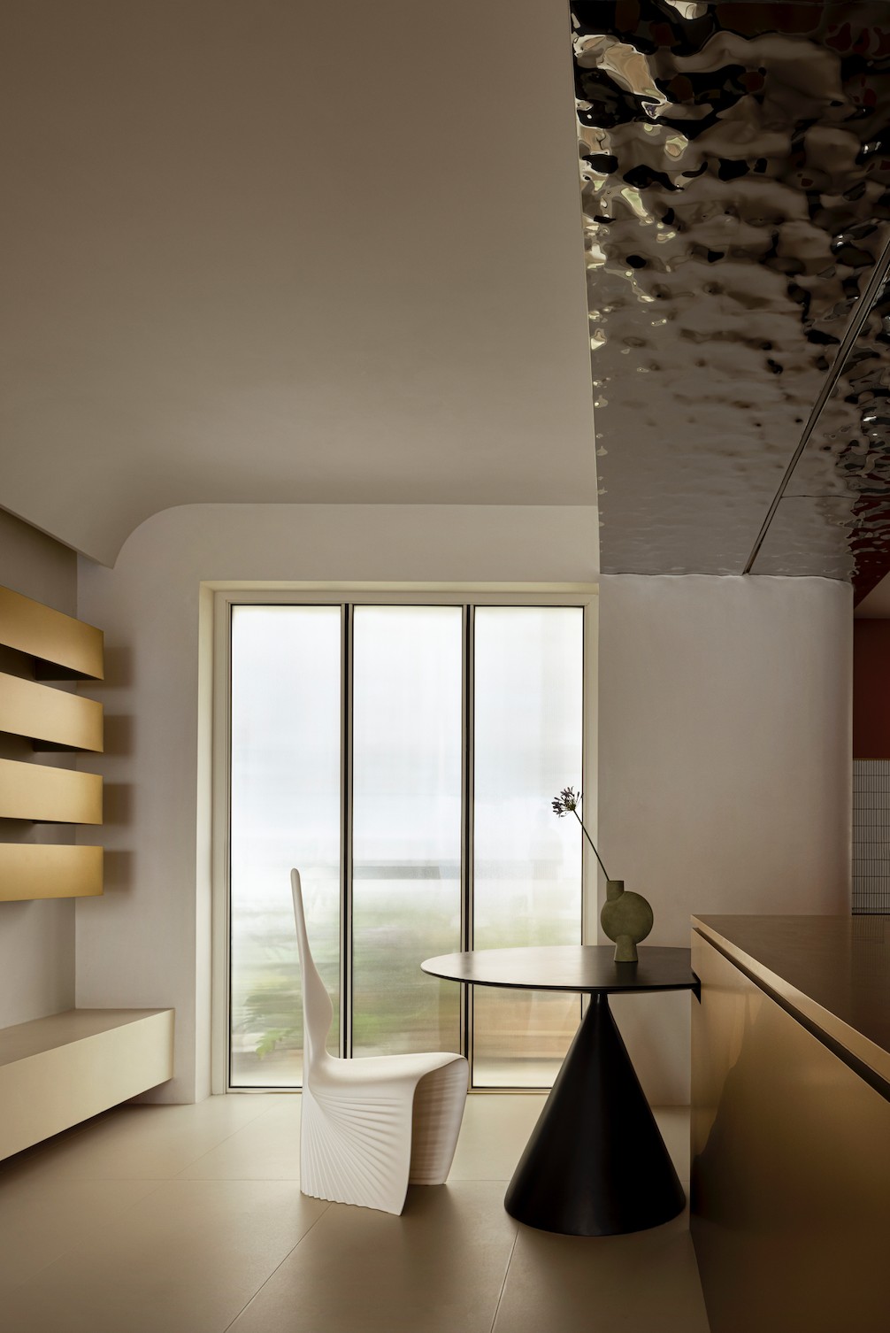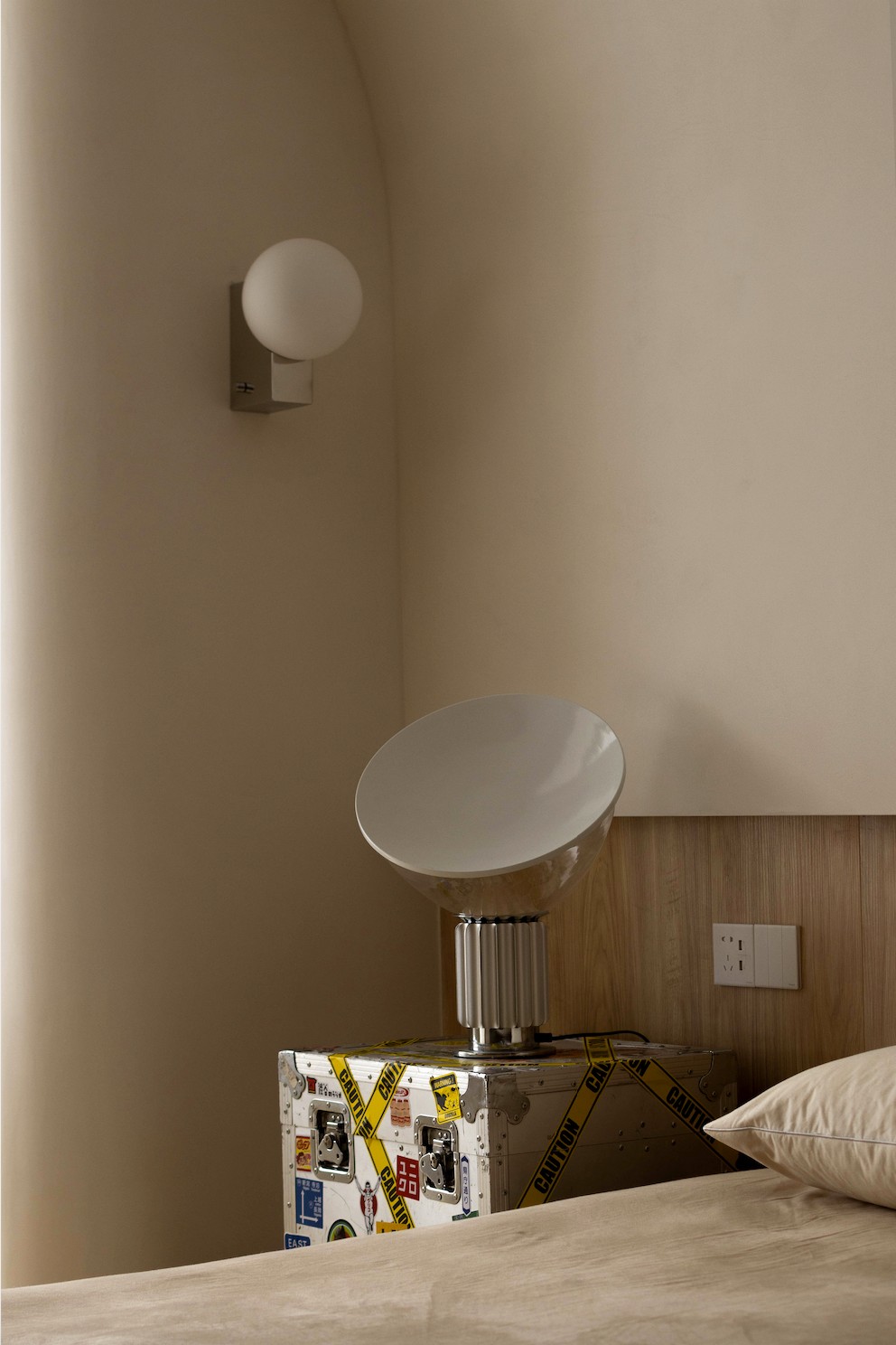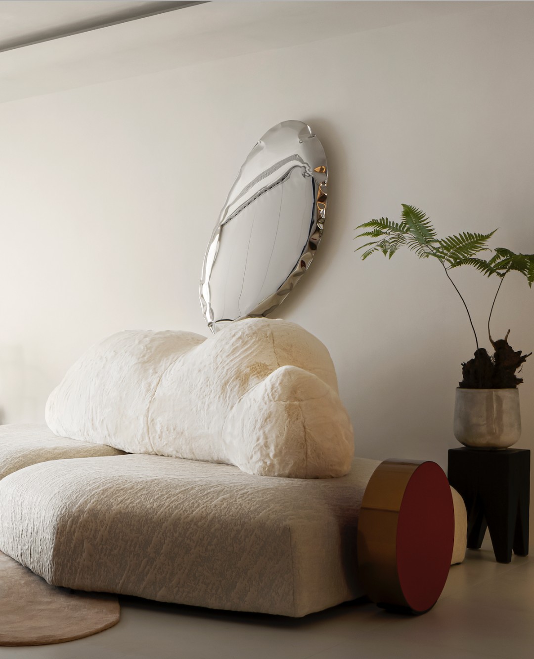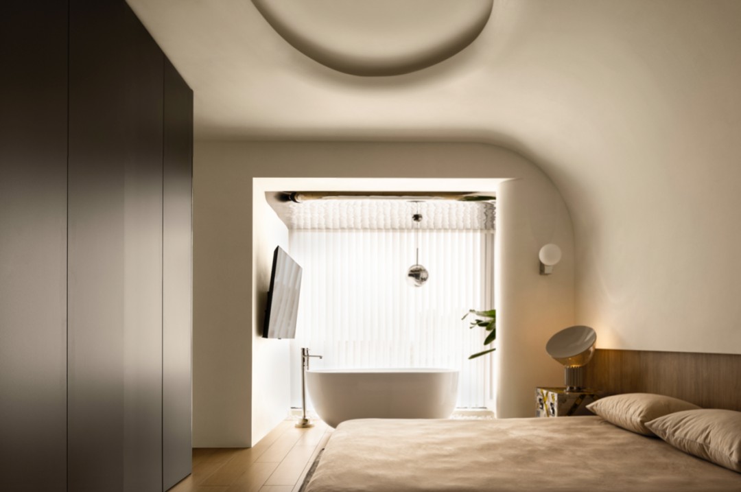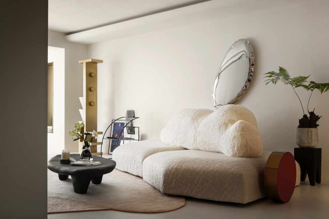 Zieta 的墙面镜,看似突兀的出现于此,但其圆润的造型和不锈钢质地的视觉冲击,瞬间给暖调空间提了气质。鼓起的气球感和边缘的褶皱让它与空间风格高度匹配,带来碰撞的艺术效果。