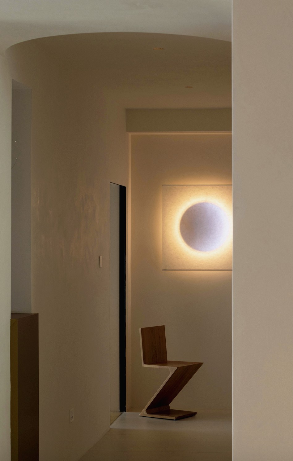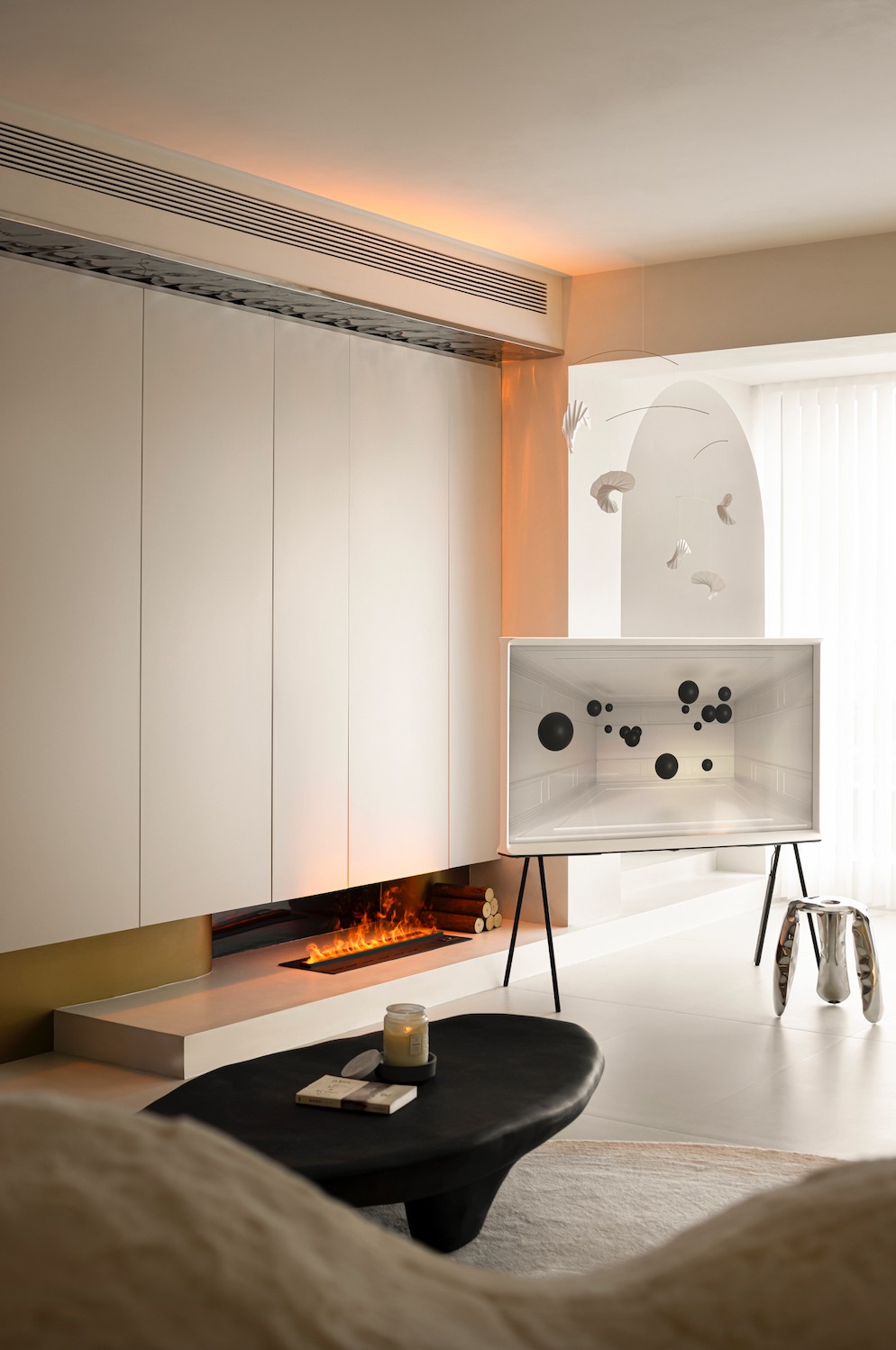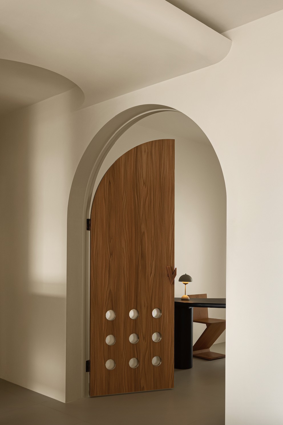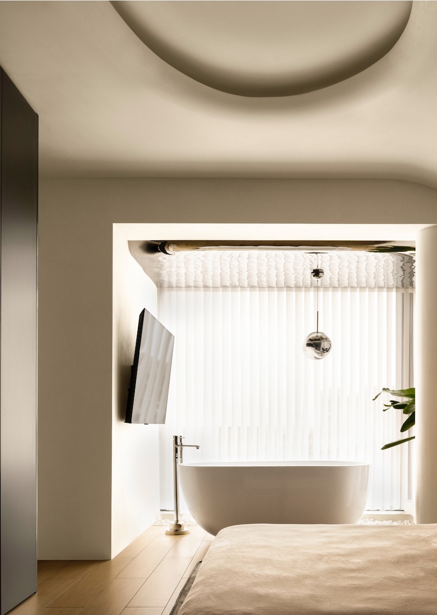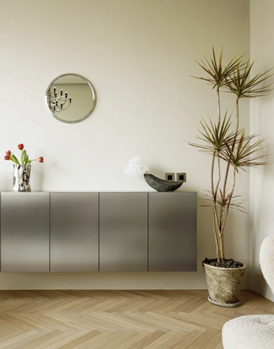 Zieta 的墙面镜,看似突兀的出现于此,但其圆润的造型和不锈钢质地的视觉冲击,瞬间给暖调空间提了气质。鼓起的气球感和边缘的褶皱让它与空间风格高度匹配,带来碰撞的艺术效果。