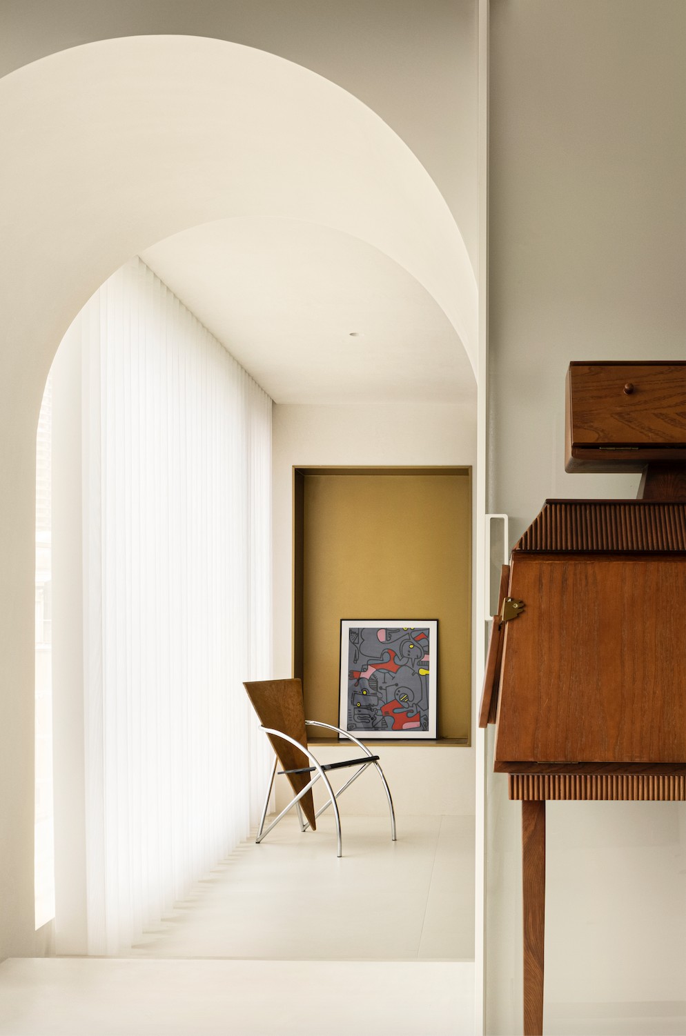 房子的原始户型是周正的南北通透大平层,但因为楼层结构承重墙占比太大,墙面几乎不能调整,所以不仅要构建全屋的通透感,更要在有限的布局里满足生活需求和艺术美感。